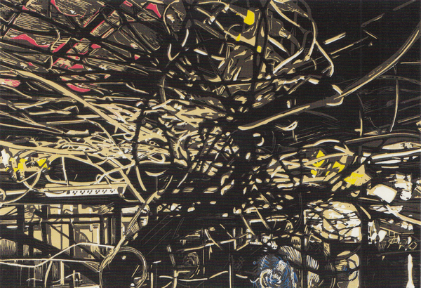 Jochen Saueracker - Robot on the Roof - linocut on canvas - 80 cm x 90 cm - one of two copies - 2022 - photo Achim Kukulies